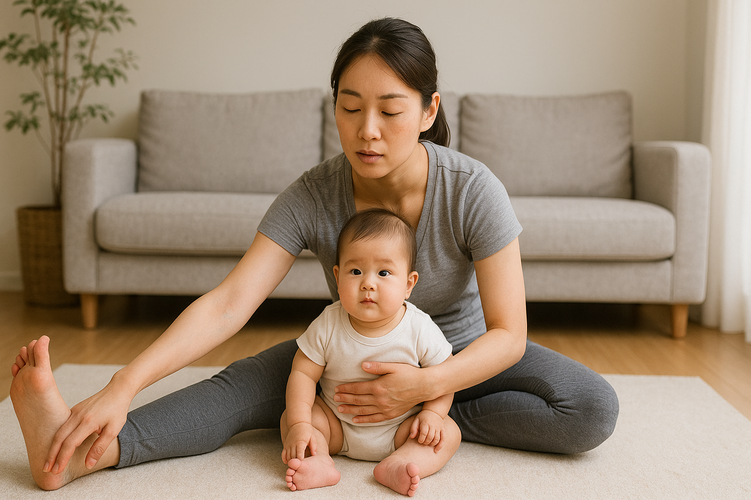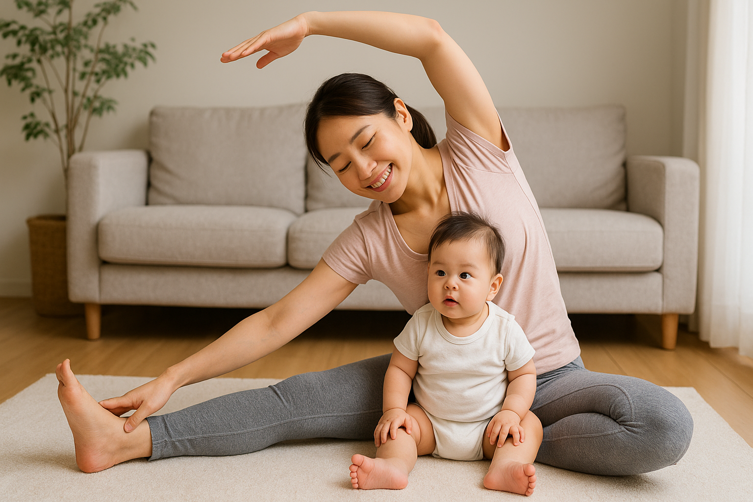 産後は筋繊維がデリケートな状態のため、20〜30秒ほど軽く伸びる程度のストレッチを続けるのが安全です。