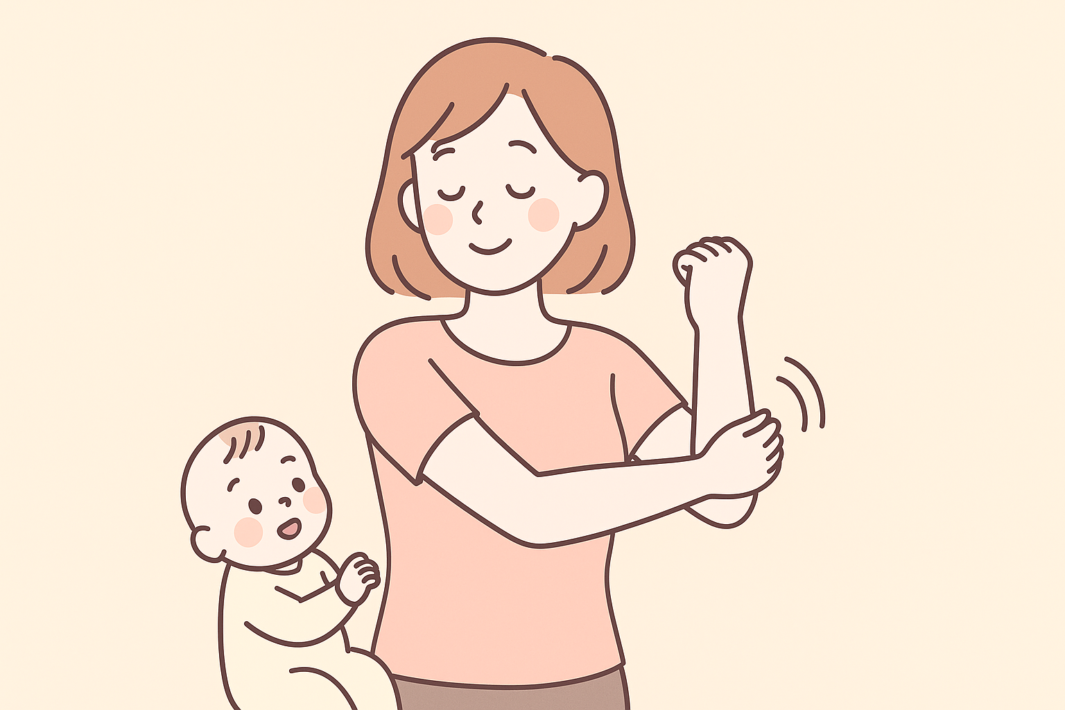 二の腕が痛いと抱っこや授乳姿勢が安定しづらくなり、さらに腕の筋肉を酷使する悪循環に陥ります。これが慢性的な張り・重だるさを引き起こしやすくなります。